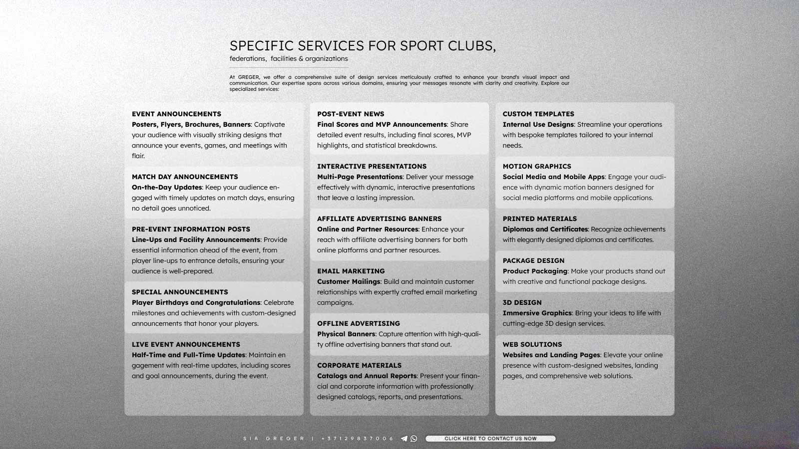 In addition to promotional materials, we also provide designs for player announcements, match day line-ups, and post-match graphics such as MVP highlights and statistics. Our goal is to enhance your communication with fans and stakeholders through high-quality visuals that convey professionalism and excitement. Trust GREGER to elevate your sports organization’s visual identity with our tailored graphic design services.
